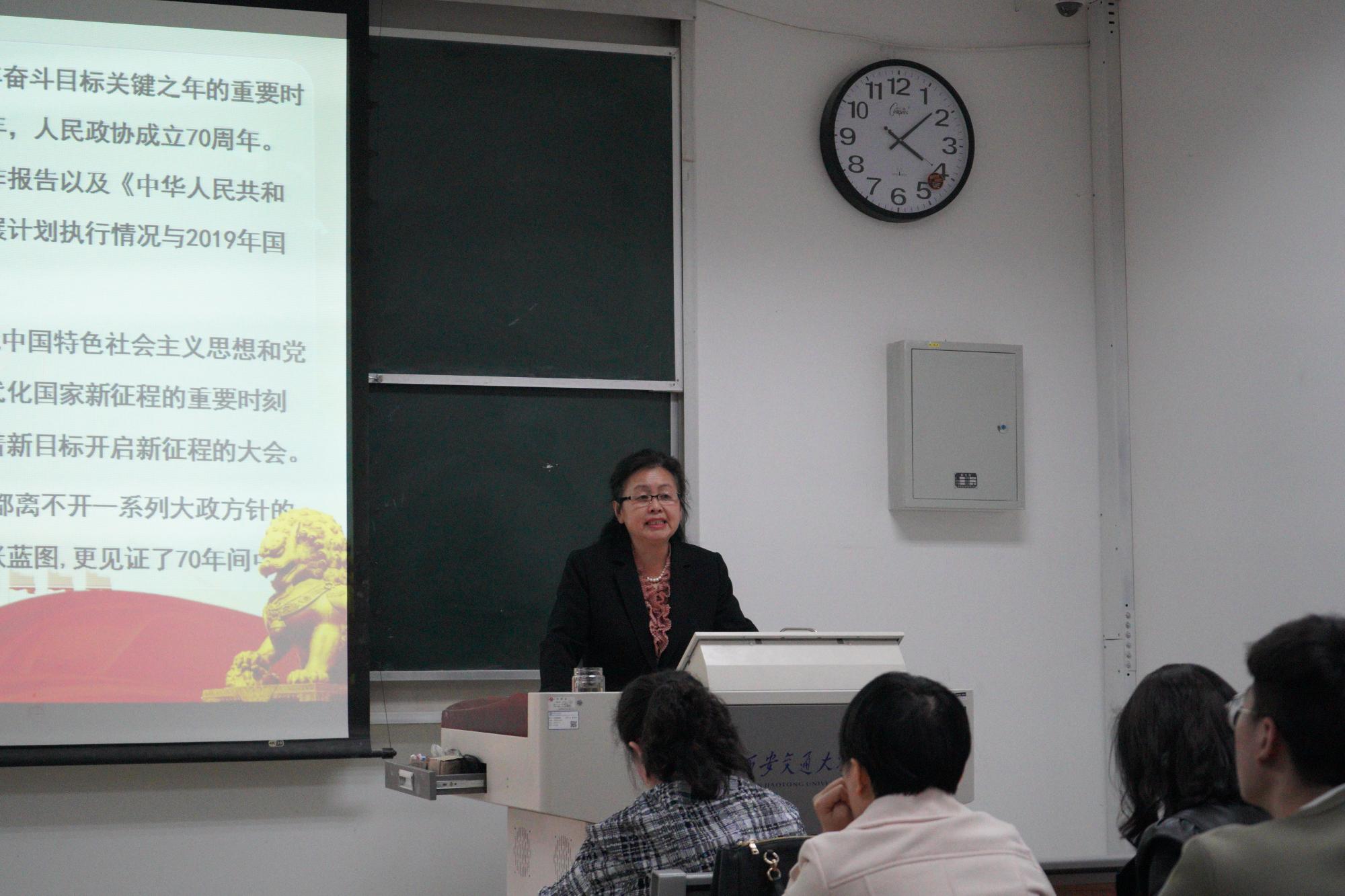 会上,李香菊委员详细介绍了全国两会的概括、领导同志重要讲话精神、政府工作报告、外商投资法、会议通道(部长、代表、委员)和陕西省委员及个人履职情况。李香菊委员结合自己亲身经历,分享了自己的学习体会。她指出,要秉承“心怀天下、不辱使命、不负担当,以真情为民的情怀”认真履行全国政协委员的职责。通过两会窗口,人们既可以观察中国当下的热门关切——从经济增长、深化改革到生态保护、扶贫攻坚、民生问题等等,也可以看到“中国式民主”的特色。李香菊委员提到,全国人大会议的突出特点之一,就是以人民为中心,直面人民群众最关心最直接最现实的利益问题,减税降费、医疗、养老等方面所实施的相关政策,都让大众受惠,为大众减轻了生活负担。李香菊委员认为西部发展离不开财税政策的支持,在翻阅大量资料、认真调研后,在2019年全国政协会议上提交了两件提案:“关于制定第三个10年西部大开发财税优惠政策的提案”和“关于统筹‘中欧班列’区域联动发展资源,提升运营效率的建议”,为西部大开发建言献策、希望将“中欧班列”打造成“一带一路”建设的“金字招牌”。通过李香菊委员的讲解使大家也了解了作为一个两会委员肩负的责任重大,工作的艰辛与不易,每一份提案都是对党和人民高度的责任感与使命感、知识与智慧、汗水和泪水的结晶。同时,李香菊委员建议各位同学要仔细阅读两会中政府工作报告,政府预决算报告等,学会通过数据分析我国经济情况,掌握未来发展的风向标。