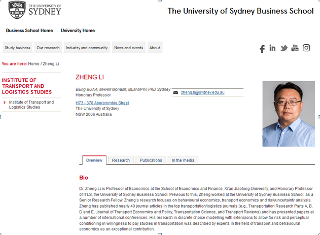 李铮教授在悉尼大学商学院的个人主页://business.sydney.edu.au/staff/zheng.li