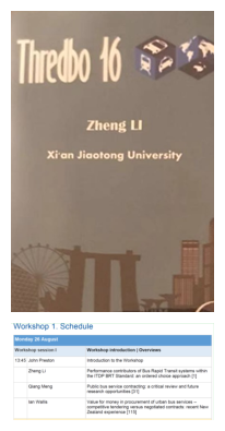 李铮教授在此次国际会议的第一分会场(Workshop 1 - Models of Mainstream Public Transport Provision)做开场报告。李铮教授的演讲题目为‘Performance Contributors of Bus Rapid Transit Systems within the ITDP BRT Standard: An Ordered Choice Approach’,同时该论文入围Thredbo 16会议最佳论文奖 - The Michael Beesley Award的候选名单。李铮教授还同新加坡国立大学、南洋理工大学、悉尼大学等的教授/学者进行了深入的讨论与交流并探讨了将来合作的可能性。