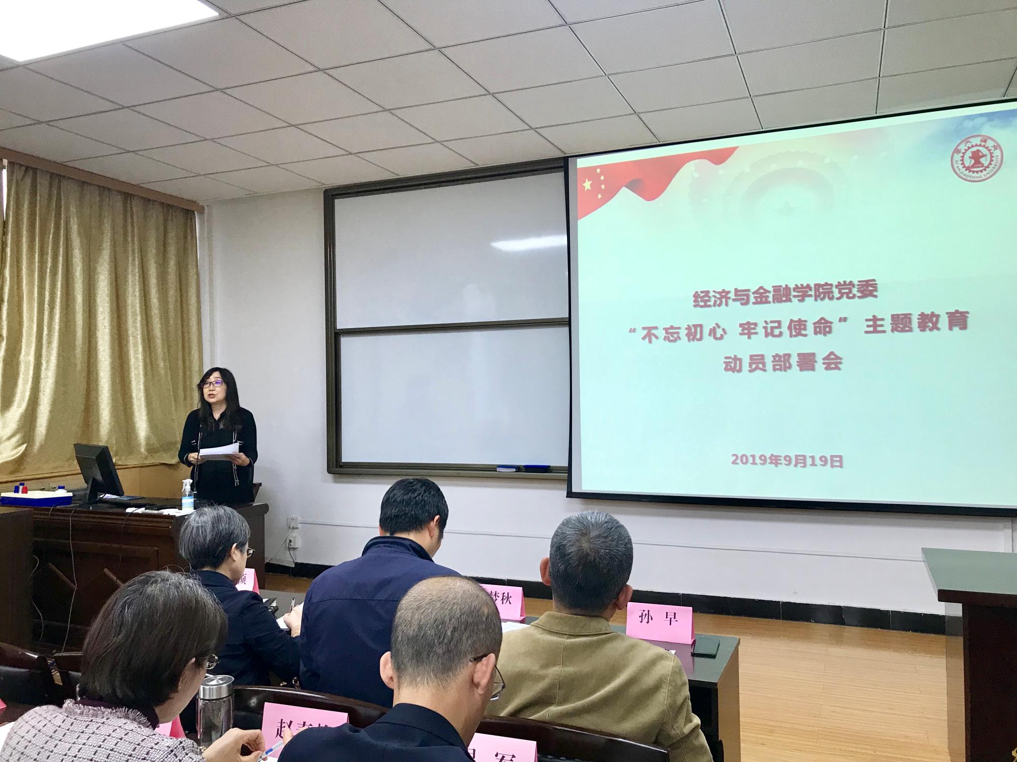 党委在财经主楼802报告厅召开“不忘初心、牢记使命”主题教育动员部署会。学院领导班子、教工党员、学生党员代表共计70余人参加会议。主题教育第十指导组联系常委张定红、成员吴孟秋、罗娴出席会议。会议由宋丽颖书记主持。
