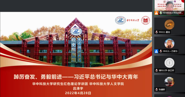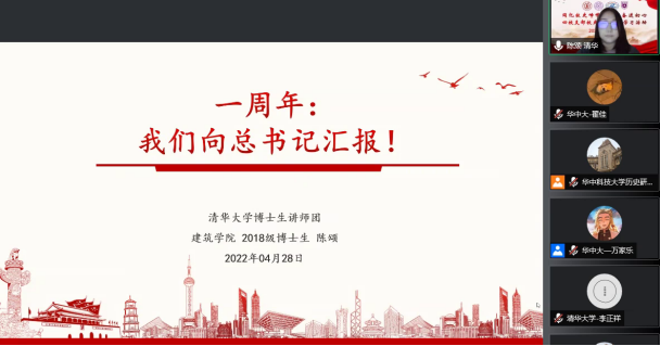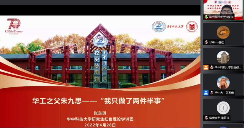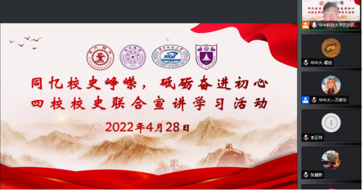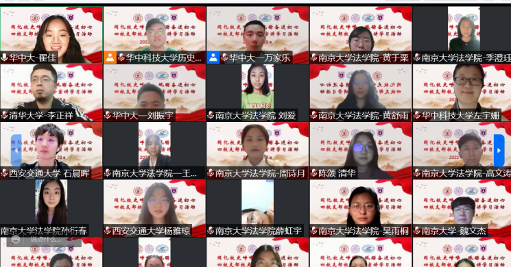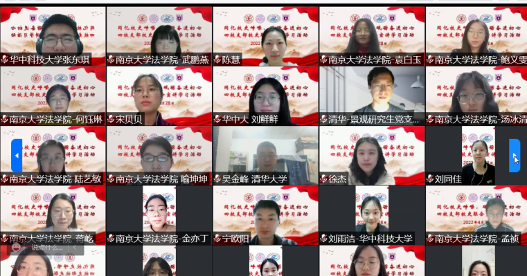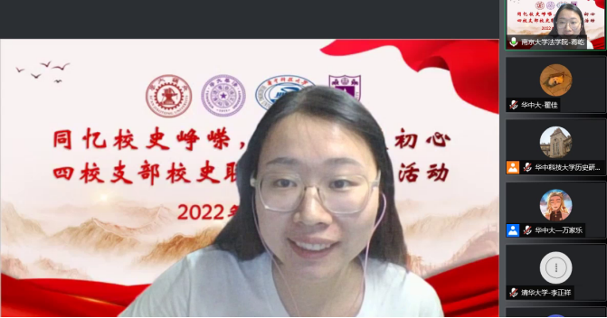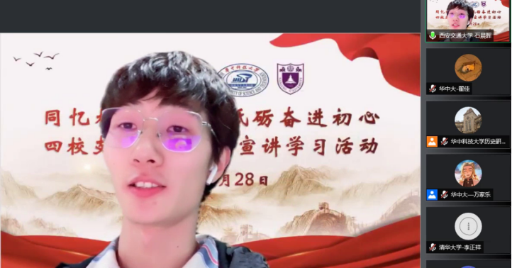 硕0156党支部、华中科技大学人文学院研究生历史专业党支部、南京大学法学院2019级法学硕士第一党支部、以及清华大学建筑学院规景联合党团支部主办的“同忆校史峥嵘,砥砺奋进初心”四校校史联合宣讲学习于线上举行。活动由华中科技大学人文学院研究生历史专业党支部书记吕涛宇同志主持。来自四所学校的百余名青年学生党员线上参加活动。