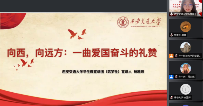 本次联合宣讲邀请了西安交通大学学生微宣讲团(筑梦社)、华中科技大学研究生红色理论学讲团、清华大学博士生讲师团以及南京大学博士生讲师团的优秀讲师进行理论宣讲,通过对四所高校的校史、院史及学科发展史的展示,为与会师生讲述了一堂丰富精彩的校史课、党史课、思政课。