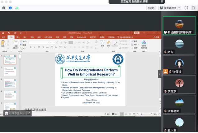 第三个议题是青年拔尖人才聂鹏研究员分享做科学研究的经验,从选题、数据、计量工具、论文写作和发表、学术交流和合作等方面进行了详细介绍。