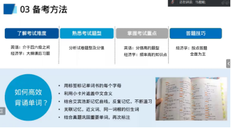 来自2018级的韩林蓉同学、2019级的屈盼婷同学、2020级的蒙科同学都是跨专业进行同等学力申硕,在分享中,三位同学都提出了调整心态和树立信心的重要性。韩林蓉同学提到,作为一名文科生,学科综合考试中的计算题对于她来说难度非常大,但是她抱着一定要通过考试的信念,总结解题方法、加深知识理解,最终考试时稳定发挥、顺利通过。蒙科同学在分享中大方晒出自己的成绩单,他考了三年最终通过2门国考。对于基础薄弱的英语科目,他在繁忙的工作之余每天坚持早读晚练,针对单词、阅读等薄弱环节,他反复练习、逐一突破,从33分到58分直到最终72分,他在学习过程中不断建立起自信。屈盼婷同学分享了自己工科背景跨考经济学专业的心路历程,她建议在职的同学尽早开始复习,面对可能出现的外界干扰和心态波动,可以动态调整学习计划,但是一定要保持复习的节奏和答题的状态。