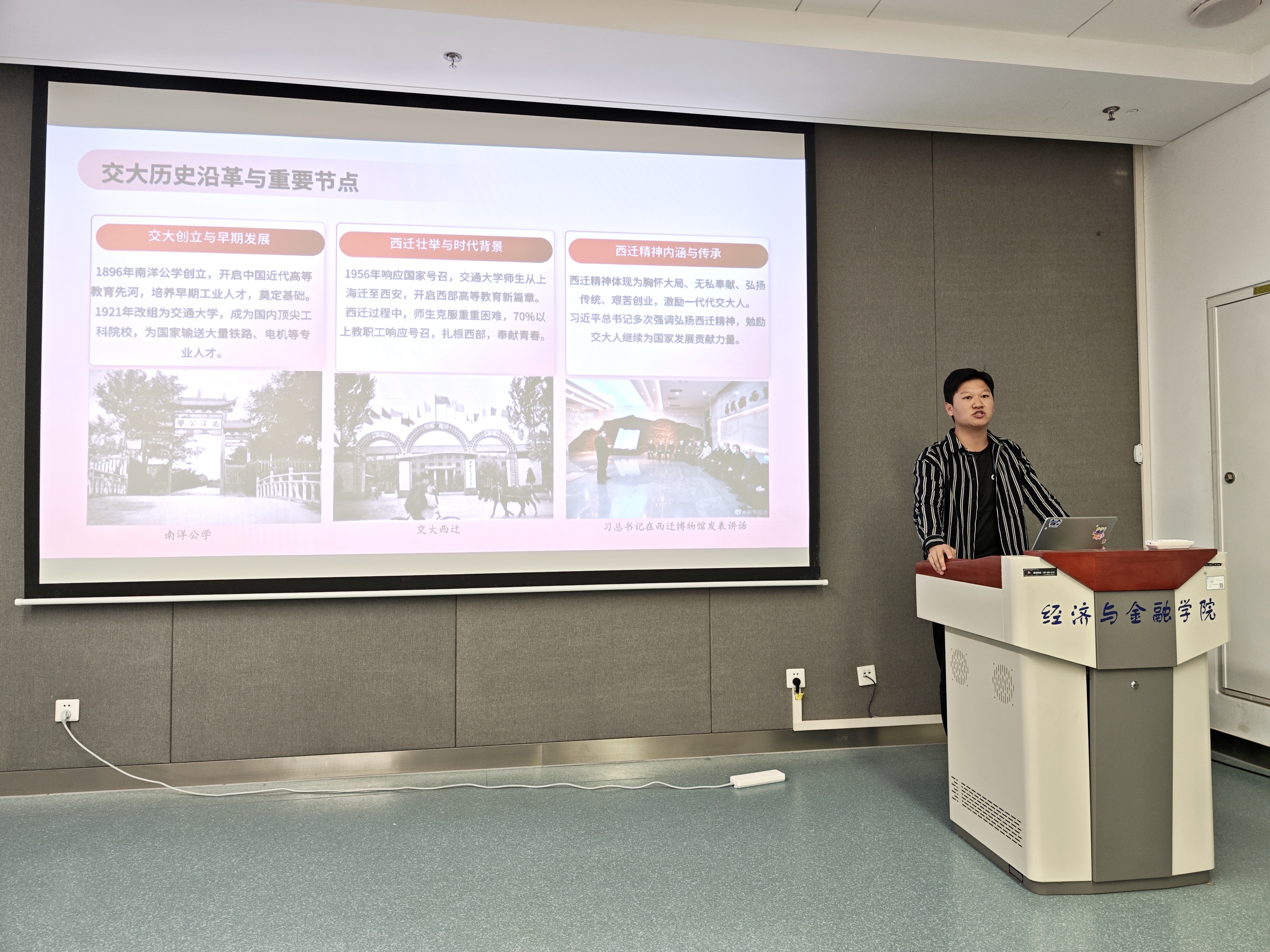王嘉乐同学以《走进交大历史,传承西迁精神》为题,通过历史纵轴上的三组精神坐标,从溯源、西迁到致远,勾勒出交大人跨越时空的使命图谱。一张张珍贵的历史影像重现交大西迁的壮阔征程,三组掷地有声的话语——没有因迁校“晚开”一天学、没有因搬迁“少开”一节课、没有因安装“迟开”一门实验,以最朴素的叙事、最铿锵的实践,诠释了这所高等学府“为党育人、为国育才”的钢铁信念。镜头里的每一帧画面,都在诉说着:纵使山河远阔、筚路蓝缕,交大人立下的教育报国誓言,从未因时空变迁褪色分毫。