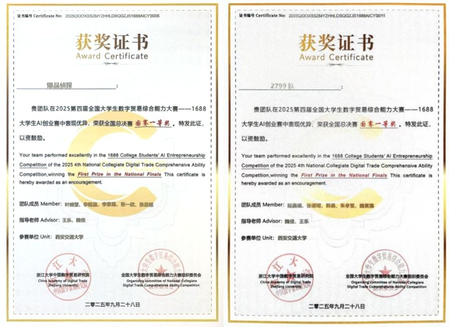 两支队伍在陕西省省赛中表现优异,成功入围国赛。在最终的国赛比拼中,两队凭借扎实的专业能力与出色的赛场发挥,分别摘得“1688数创铜星”和“1688数创之星”奖项,并双双斩获国赛一等奖,且各获得创业基金。两支队伍的精彩表现,充分展现了学院在数字经贸领域扎实的育人成果,以及学生的综合创新能力。