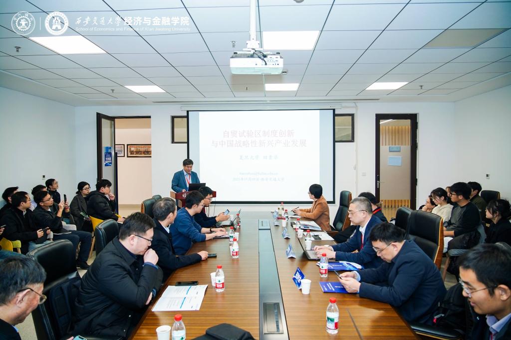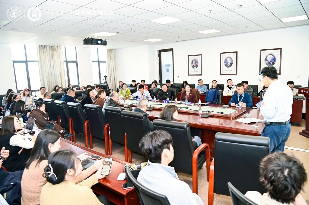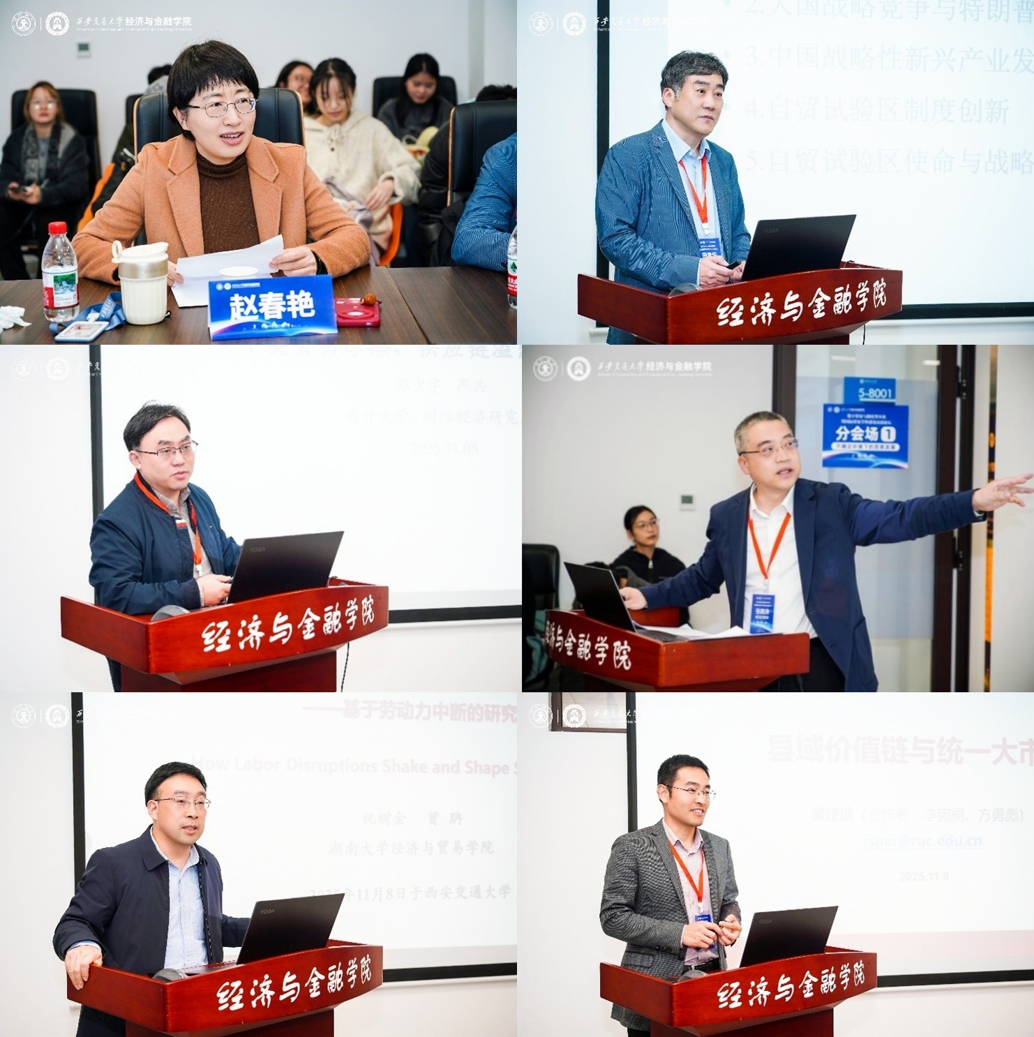 副院长赵春艳教授主持。多位专家围绕自贸试验区创新、供应链稳定等关键议题展开深入讨论。其中,复旦大学田素华教授探讨了自贸试验区制度创新对中国战略性新兴产业的推动作用;南开大学严兵教授分析了中美贸易摩擦背景下的供应链溢出与稳外资策略;中央财经大学张晓涛教授基于国内企业证据,解析了外部需求转移与企业创新的关系;湖南大学祝树金教授从劳动力市场视角评估了外部冲击对供应链的影响;中国人民大学裴建锁教授提出以“县域上游度”为新视角,解读区域发展差异。