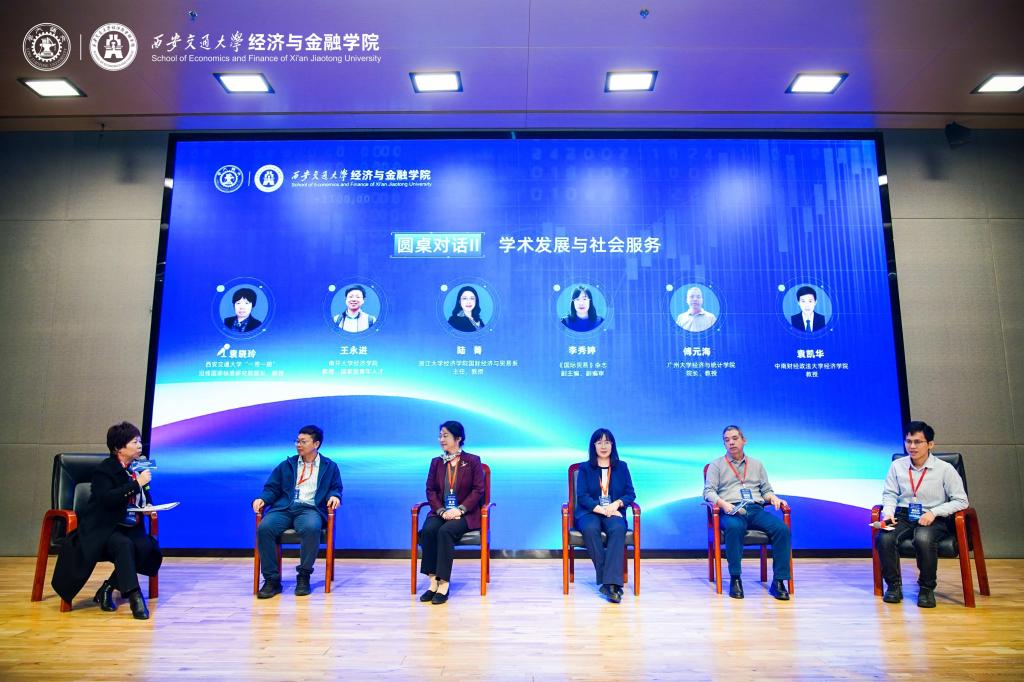 在“学术发展与社会服务”圆桌对话环节,南开大学王永进教授、浙江大学陆菁教授、《国际贸易》杂志副主编李秀婷副教授、广州大学经济与统计学院院长傅元海教授、中南财经政法大学袁凯华教授围绕数字贸易国际规则发展动态,深入探讨学术研究如何对接国家战略与社会需求。该环节由西安交通大学“一带一路”沿线国家标准研究院院长袁晓玲教授主持。