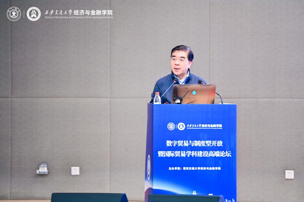 孙早在致辞中对与会专家学者的到来表示欢迎和感谢。他表示,数字贸易与制度型开放是新时代国家对外开放战略的核心议题,国际贸易学科建设需主动对接国家需求、回应时代命题,并提出深化理论创新服务国家战略、加强高校学科协作共享资源、推动产教融合赋能产业三点倡议。他回顾了西安交大国际贸易学科30余年的发展积淀,强调学校将持续深化理论创新与产教融合,加强学科协同与资源共享,扎根西部,助力数字贸易发展。
