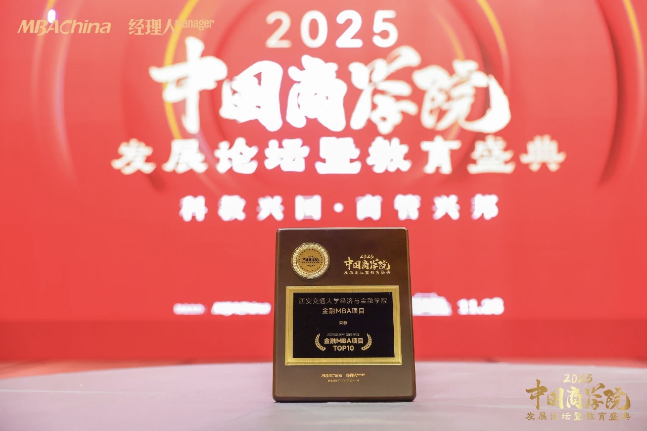 11月28日,由MBAChina和《经理人》杂志联合主办的2025年度中国商学院发展论坛暨教育盛典在北京隆重举办。在本届盛典发布的2025年度中国商学院排行榜中,西安交通大学金融MBA项目荣获“金融MBA项目TOP10”。同获此荣誉的还有清华大学五道口金融学院、上海交通大学安泰经济与管理学院、中央财经大学金融学院、中国人民大学商学院等国内一流商学院金融MBA项目。