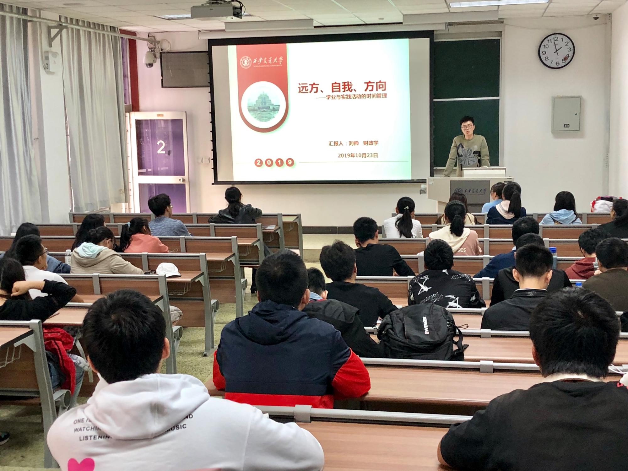 2019年10月23日,“知新讲坛”之学习经验交流会第二期在西配102举行。经济99班班主任张雅丽副教授主持,2016级财政学专业刘帅、高慧敏和张学智三位同学以“远方、自我、方向”为主题,与大家分享了自己大学三年的学习经验,三位主讲人均已保送至赌博平台