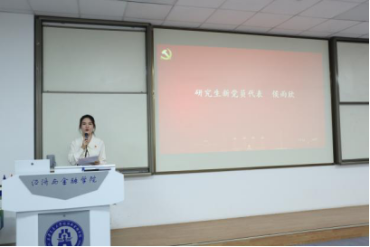 硕1154党支部侯雨欣同志代表研究生新党员发言。她表示今天完成了加入党组织这一人生奋斗目标深感激动和自豪,入党不仅是一份荣耀,更是一种责任,是将自发地热爱祖国的崇高情怀变成自觉地必须践行的责任,是将自发地帮助他人的高尚品德变成自觉地全心全意为人民服务的责任。她将和全体研究生新发展党员一道,以今天为一个新的起点,以入党宣誓为新的动力,切实践行向党和人民做出的庄重誓言。