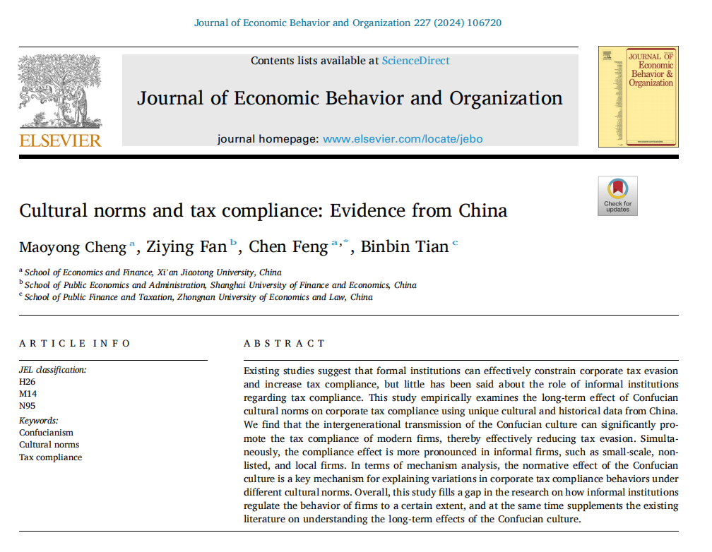 程茂勇教授、冯晨教授及合作者上海财经大学范子英教授、中南财经政法大学田彬彬教授(作者顺序按音序排列)的研究成果“Cultural norms and tax compliance: Evidence from China”,基于我国四川省独特的土司制和郡县制的历史分布场景,着重关注了以儒家文化为代表的文化规范性约束对于企业纳税遵从行为的长期影响。研究结果发现,儒家文化的代际传承能够显著促进当代企业的税收遵从行为。同时,纳税遵从效应在小规模企业、非上市企业、本地企业等表现得更加明显。就作用机制来看,这种规范性约束正是解释不同文化特征下企业纳税遵从行为差异的重要机制。总体来说,该研究在一定程度上补充了关于非正式制度如何规范企业行为的相关研究进展,以更好地理解儒家文化的长期影响。上述研究成果目前在行为与组织经济学旗舰期刊Journal of Economic Behavior & Organization(JEBO)上正式发表。