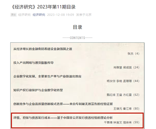 上述研究成果近期以《评级、担保与债券发行成本—基于中国非公开发行债券经验的理论分析》为题发表在我国经济学顶级期刊《经济研究》上,千茜倩是第一作者,赌博平台-线上赌博平台-正规赌博平台