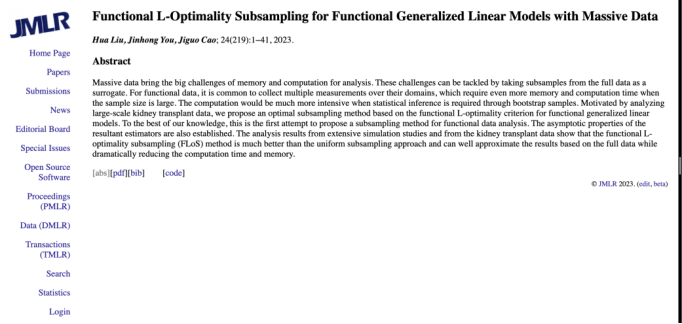 近日,上述研究成果以《大规模函数型广义回归模型下的最优抽样方法FLoS》(Functional L-Optimality Subsampling for Functional Generalized Linear Models with Massive Data)为题发表在机器学习和人工智能领域国际顶级期刊Journal of Machine Learning Research(简称JMLR)上。刘华是第一作者,赌博平台-线上赌博平台-正规赌博平台