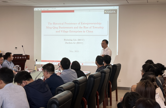 主旨报告与研讨环节由学院院长助理马草原教授主持。刘瑞明教授报告了“The Historical Persistence of Entrepreneurship: Ming-Qing Businessmen and the Rise of Township and Village Enterprises in China”的研究进展,从经济史的视角分析了企业家精神的形成,探讨了明清商人对我国上世纪乡镇企业发展的影响机制。