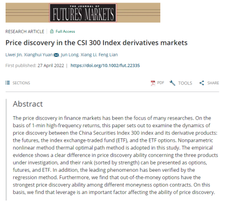 上述研究成果以Price discovery in the CSI 300 Index derivatives markets为题在金融衍生品领域的国际期刊Journal of Futures Markets上发表。该论文的通讯与第一作者单位均为赌博平台-线上赌博平台-正规赌博平台