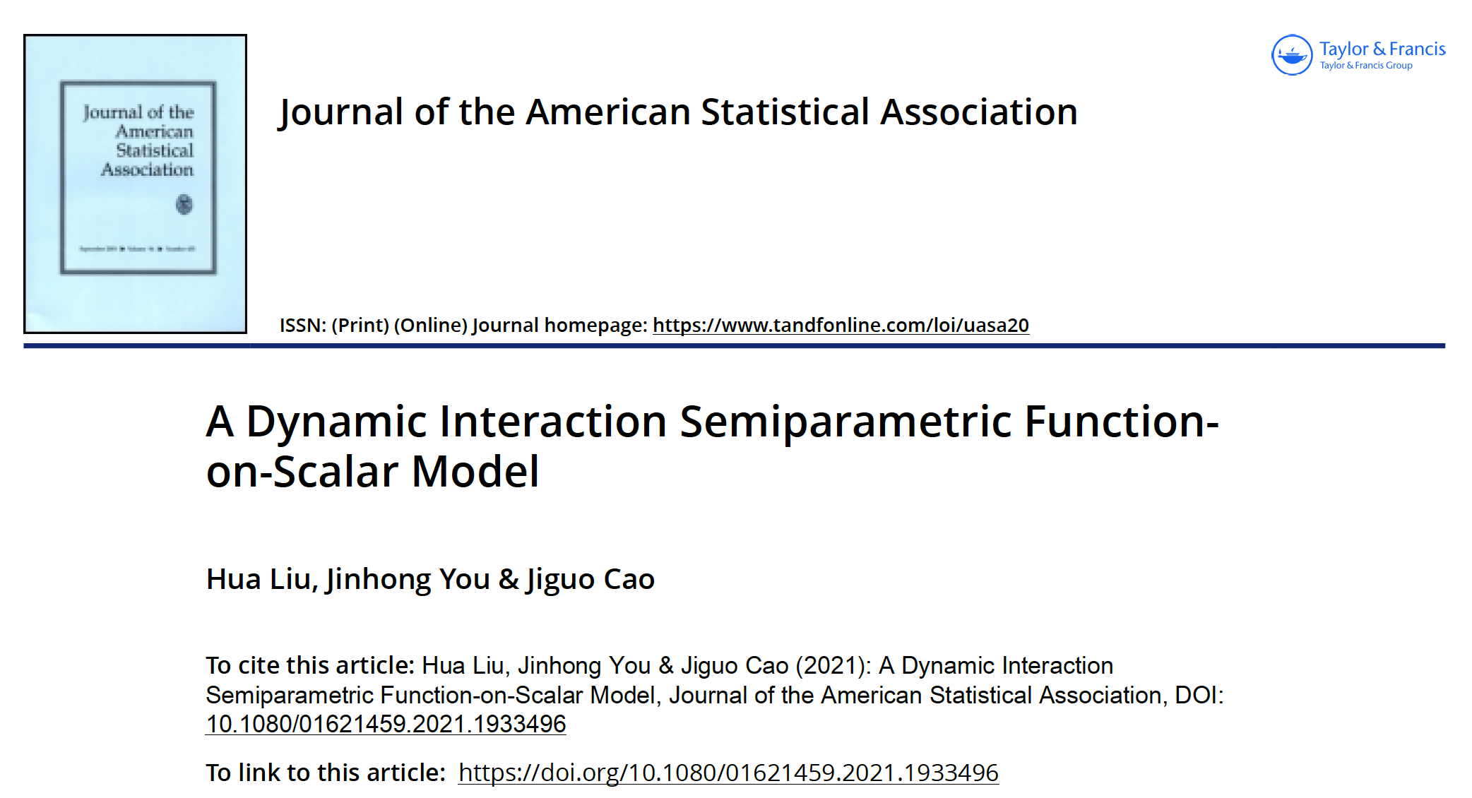 近日,上述研究成果以《带有动态交互效应的半参数函数型回归模型》(A Dynamic Interaction Semiparametric Function-on-Scalar Model)为题在线发表在国际统计学顶级期刊《美国统计学会会刊》(Journal of the American Statistical Association,简称JASA)上。刘华是第一作者,赌博平台-线上赌博平台-正规赌博平台