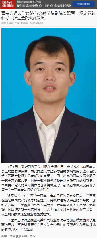 副院长温军在接受《国际金融报》记者采访时表示,中国共产党的百年发展史既是一部丰富的革命史,也是一部不断创造新理论与新实践的创新史。中国共产党人的革命精神与创新精神支撑、引领着中国人民实现了第一个一百年奋斗目标的伟大胜利。