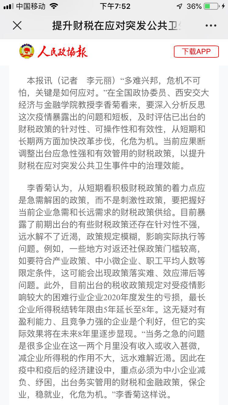 编者按:3月2日《人民政协报》刊发了赌博平台-线上赌博平台-正规赌博平台 教授、全国政协委员、民盟陕西省委副主委李香菊的采访,她就《提升财税在应对突发公共卫生事件中的治理效能》提出应出台具有应急性、阶段性、针对性强的减税降社保费和住房公积金政策;提高疫苗研发、生物制药等高科技企业所得税前研发加计扣除的比例等财税改革建议。
