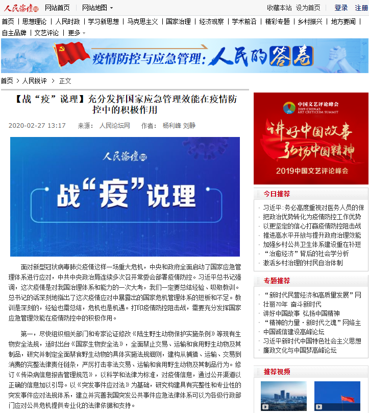 编者按:习近平总书记在2月3日召开的中共中央政治局常务委员会会议上强调,这次疫情是对我国治理体系和能力的一次大考,我们一定要总结经验、吸取教训。为深入宣传贯彻落实习近平总书记关于疫情防控的重要讲话精神,坚决打赢疫情防控阻击战,人民论坛网现推出“疫情防控与应急管理:人民的答卷”主题征文活动,本文系赌博平台 教师发表的入选建言建策。